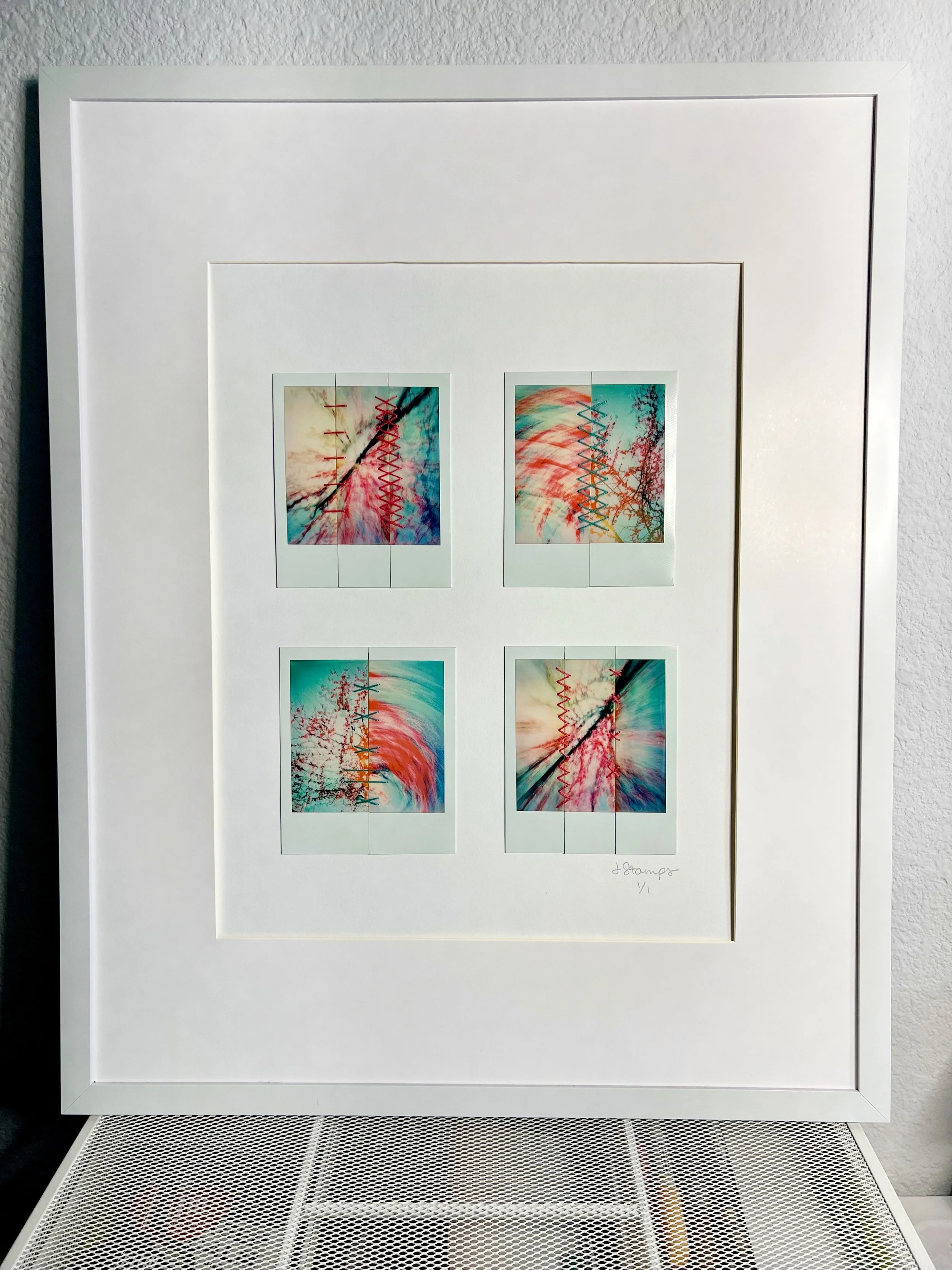 I then took four Polaroid prints of the tree, cut them up, shuffled the pieces, and stitched them back together. The result is a composition that embodies the spirit of wabi-sabi and kintsugi, where beauty is found in the fragmented and the fleeting.